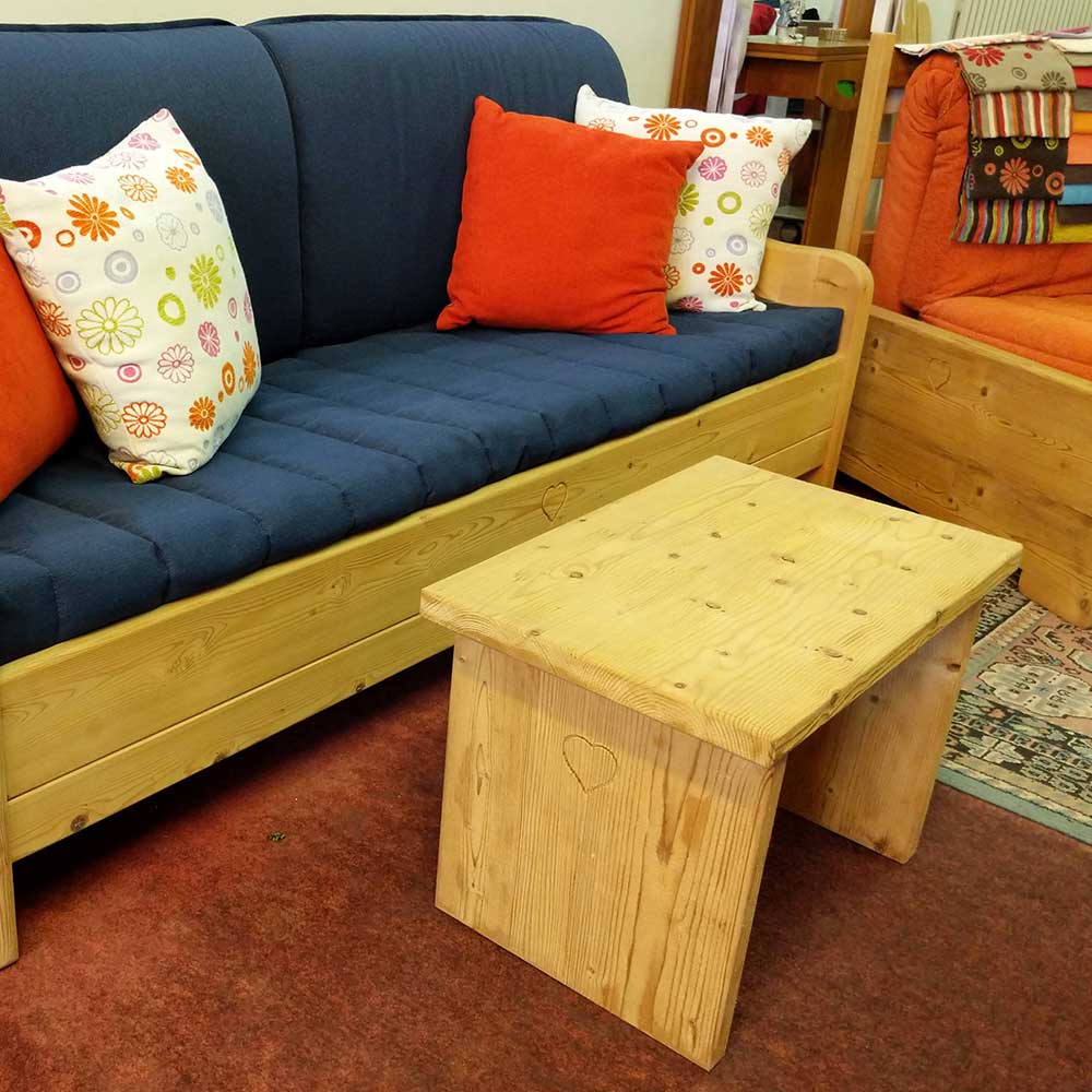In legno di abete naturale completo di due cuscinoni schienali sfoderabili, coprimaterasso sfoderabile in tessuto di cotone. Rete a doghe in legno, misure: 202x86x94h.